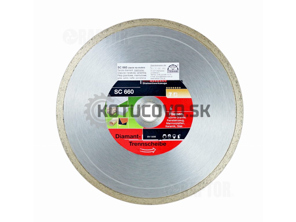 Model TEDIAM SC Ø250 mm patrí do kategórie premium a je určený na priemyselné aj profesionálne použitie. Kontinuálny veniec s jemnozrnným diamantovým segmentom zaručuje extrémne presný, hladký a čistý rez aj pri práci s najtvrdšími materiálmi – od gresových dlaždíc až po mramor či sklo.