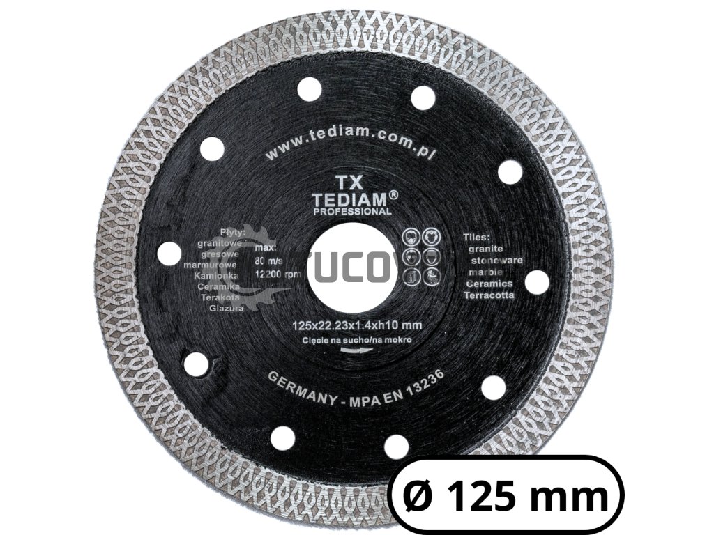 Kotúč TEDIAM TX je vyrábaný technológiou horúceho spekania diamantového segmentu, čo zvyšuje jeho hustotu a životnosť. V kombinácii s ryhovaným vencom a zosilnenou flanšou získava používateľ profesionálny nástroj pre presné a dlhodobé rezanie aj pri vyšších otáčkach (max. 12 220 ot./min).