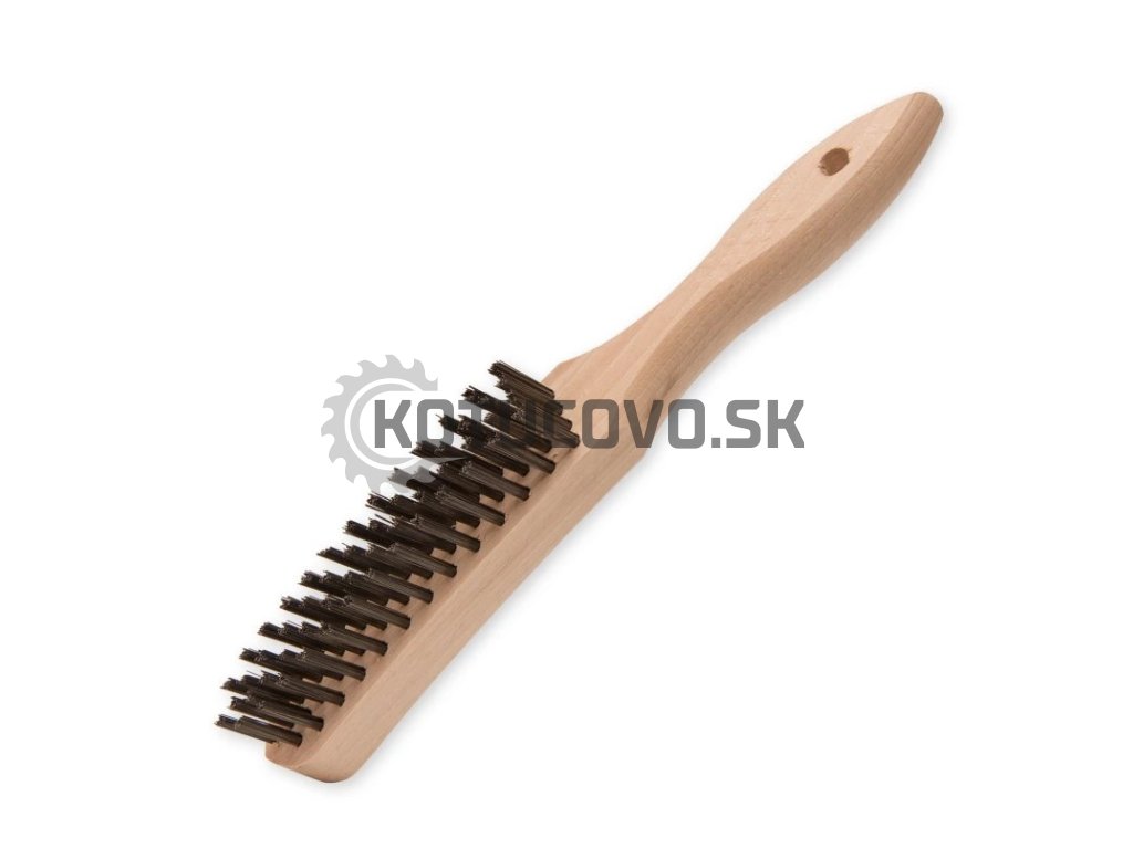 Ak hľadáte odolný a účinný kartáč na tvrdohlavú hrdzu či hrubé nečistoty, oceľový ručný kartáč s drevenou rúčkou je tou pravou voľbou. Vďaka hladkému oceľovému drôtu Ø0,30 mm a osadeniu v 4 radoch je ideálny na agresívnejšie čistenie kovov, prípravu povrchov pred zváraním alebo natieraním, aj na renovácie nástrojov.
