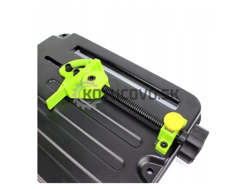 Stojan je vyrobený z odolného hliníka s presne opracovanými kovovými vodičmi s priemerom 10 mm, ktoré umožňujú hladký a presný posuv. Zariadenie má nastaviteľnú hĺbku rezu a blokádu posuvu pre bezpečnú prácu. Samočinný návrat posuvu zabezpečuje efektívnosť a plynulosť pri opakovaných rezoch. Súčasťou je aj praktická a pohodlná rukoväť.